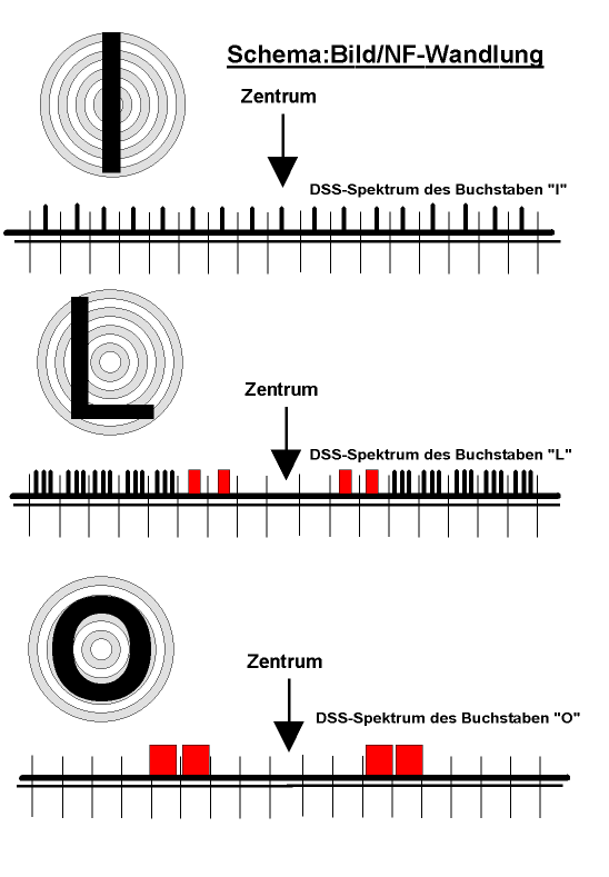 Weitere Überlegungen zum DSS-Verfahren haben sich mit dem Zentrum des inneren Spiralscanns beschäftigt und die Natur zeigt erstaunliche Parallelen: Wenn ein "normal" sehender Mensch einen lichtschwachen Stern anfixiert, so kann er ihn nur dann wahrnehmen, wenn er "etwas daneben" blickt ! Das absolute innerste Sehzentrum ist also blind!!! Diese "Leerstelle" scheint nur so erklärbar, daß, wenn es sie nicht gäbe,- auch das menschliche Auge für eine durch das Zentrum gehende gesehene Linie keine im Spektrum harmonische symmetrische lineare Abtaststruktur bilden könnte (Eine Kammstruktur mit "gleichen Zinkenabständen" in Spektrum käme sonst nicht zu Stande)!