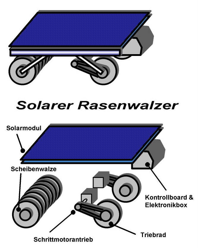 Mit einem Solarmodul läßt sich eine solche selbstfahrende Rasenwalze ständig mit Antriebsenergie versorgen. Die Walze selbst wird am besten als Rad-Stapel ,-also einzelnen "Rollsegmenten",-gebaut, damit Kurven gefahren werden können, weil so eine Art "Differenzialwirkung" erzielt wird. Als Antriebsmotoren eignen sich Schrittmotoren. Bei paariger Anordnung mit jeweils eigenem Triebrad haben sie den Vorteil, daß keine weitere aktive Lenkmechanik nötig ist, weil dem einzelnen Rad individuelle Drehwinkel (Anzahl an "Steps") zugeteilt werden können, sodaß Kurvenfahrt aktiv ermöglicht wird. Die Antriebsachsen müssen dann natürlich auch wenigstens etwas passiv schwenkbar sein. Kleinste Schwenkwinkel von nur wenigen Grad reichen aus, wenn ein solcher "Rasenwalzer" Streifen abfährt und bei jedem Vor- und Zurückfahren den Fahrstreifen etwas verlagert. Speziell rechtwinklige Flächen können so prima "bearbeitet" werden.