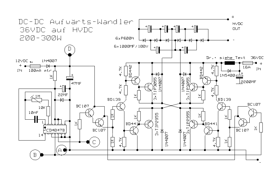 Die Brücke treibt die vorher beschriebene "Trimborn-Kaskade". Bei hier eingesetzten 36 V braucht man 6 Stufen, bei 48 V vier, bei 24 V 8 bis 10. ( Die Schaltung kann auf diese Spannungen angepaßt werden, indem man lediglich Ru und Rul im Treiberkreis entsprechend anpaßt. Ansonsten ist kein Bauteil in seiner konkreten Dimensionierung kritisch.